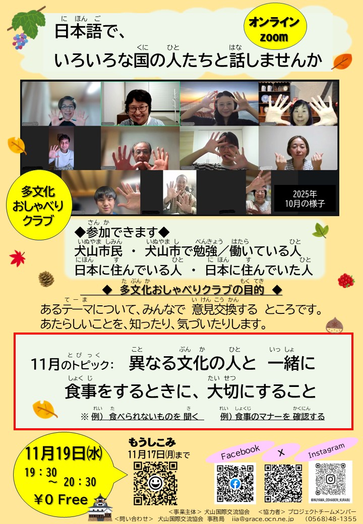 「多文化(たぶんか)おしゃべりクラブ~オンライン~<11月(がつ)>」のご案内