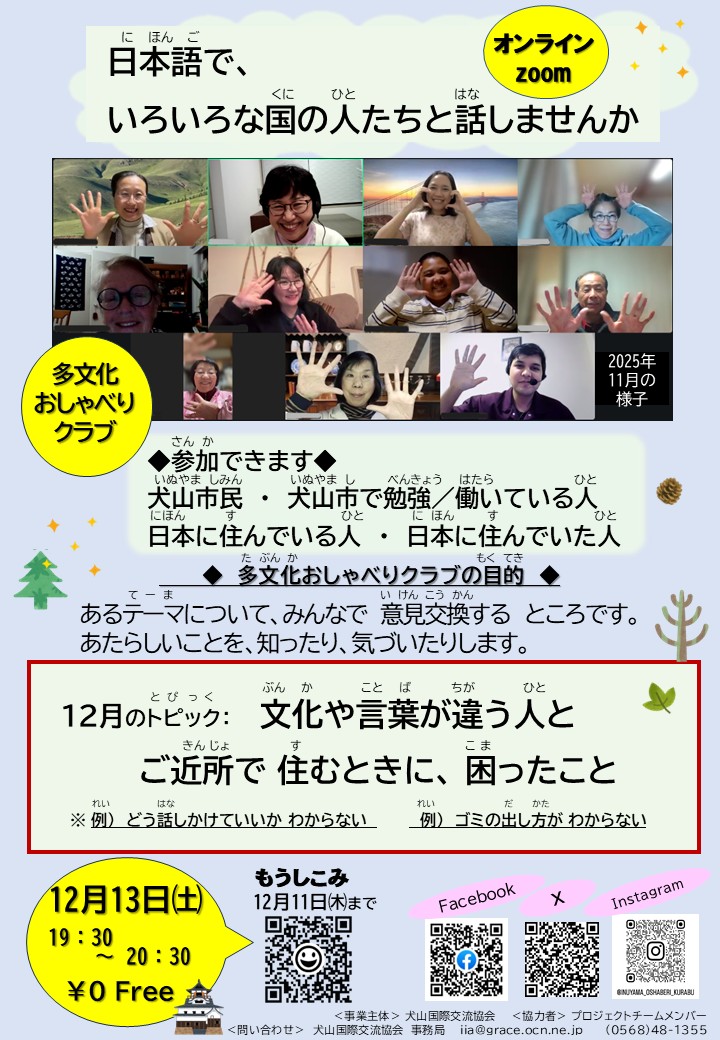 「多文化(たぶんか)おしゃべりクラブ~オンライン~<12月(がつ)>」のご案内